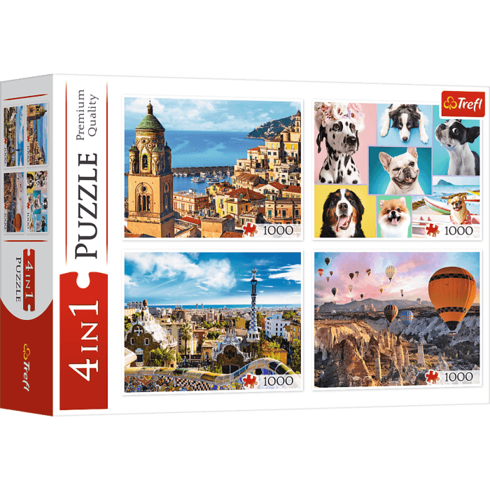Puzzle 4x1000 el. Amalfi, Barcelona, Balony i Pieski