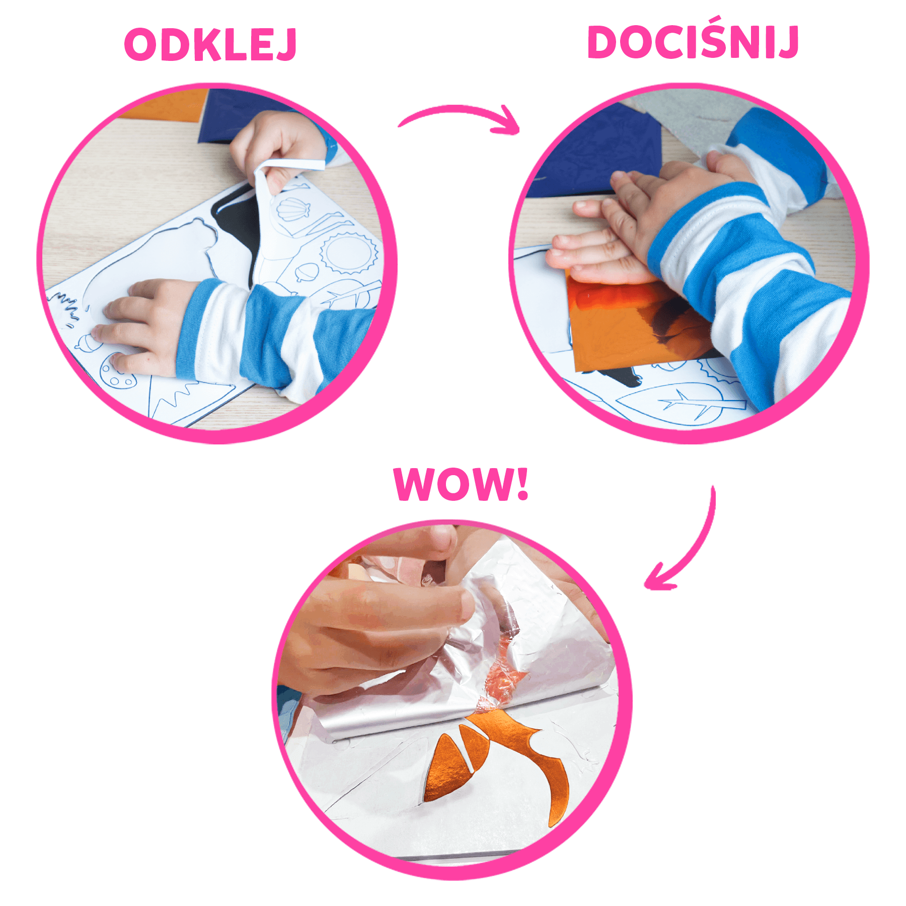 Zabawa jest prosta i wciągająca – wystarczy odkleić wierzchnią warstwę piankowej naklejki, przyłożyć kolorową folię i docisnąć. Folia przyklei się do powierzchni, tworząc efektowne wzory, a naklejane oczka dodadzą obrazkom zabawnego charakteru.